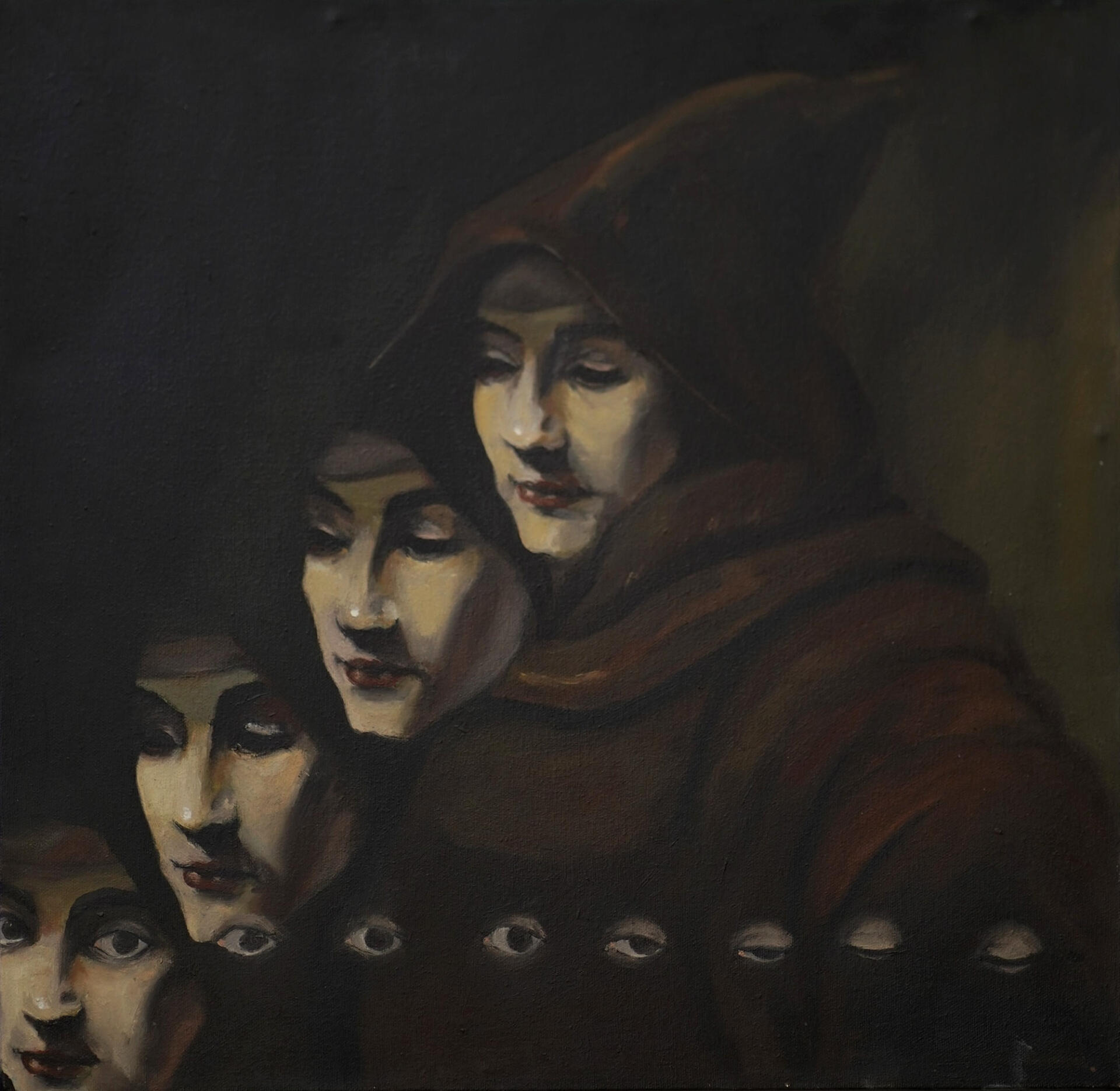 I prefer to paint non-real people, because they can act as both extensions of myself, and embodiments of the human condition. My reactions to real world issues help fuel emotion into my work, whether it be disappointment, melancholy, or disjointedness. Music influences the tone in my work and helps to kickstart my brainstorming process. I have a deep love and fascination for historical art, especially in the Baroque period. This inspiration lends to my choice of color and composition. Horror media is my final influence. This inspires a lot of my more unnerving subject matter. I can’t say why I am fascinated by the ominous, but I just find the combination of beauty and oddity creates an interesting sense of uneasiness and isolation, especially when portrayed subtly.