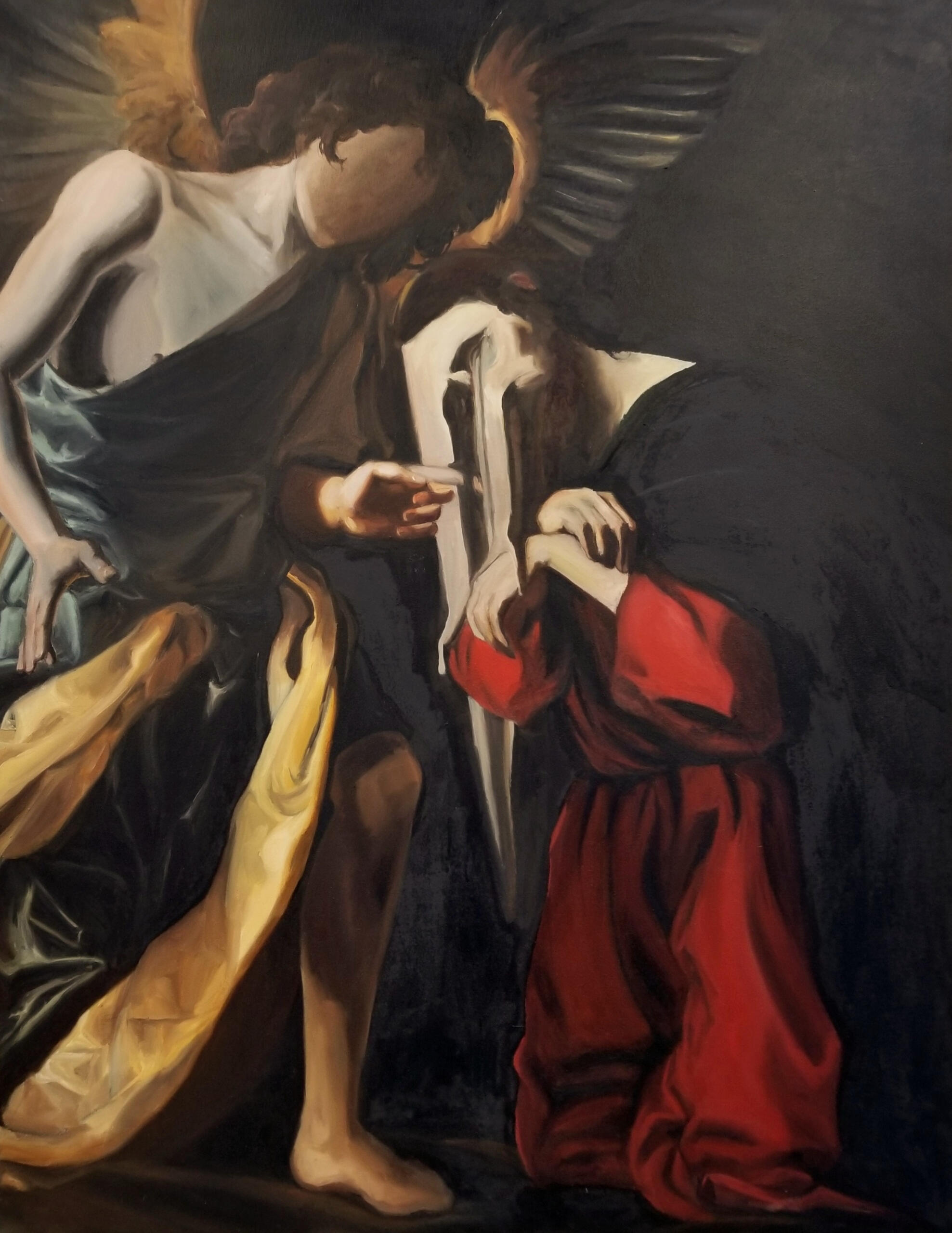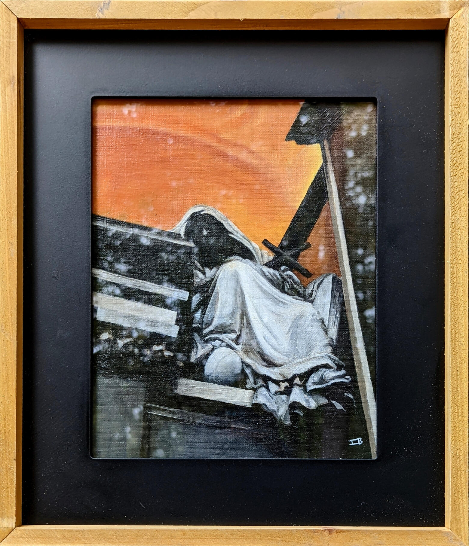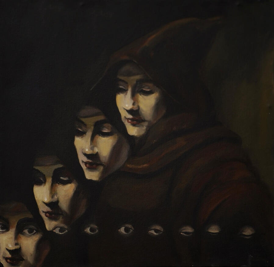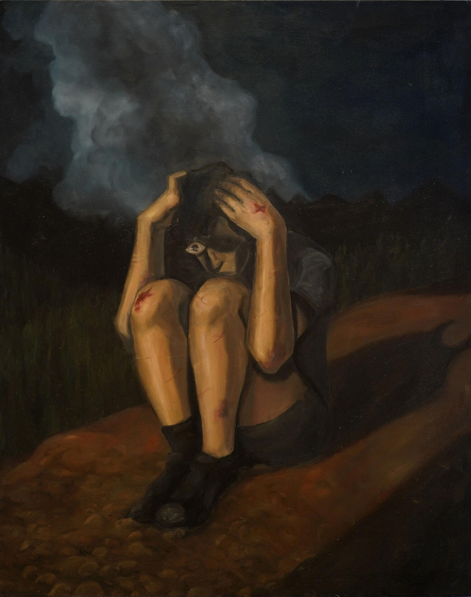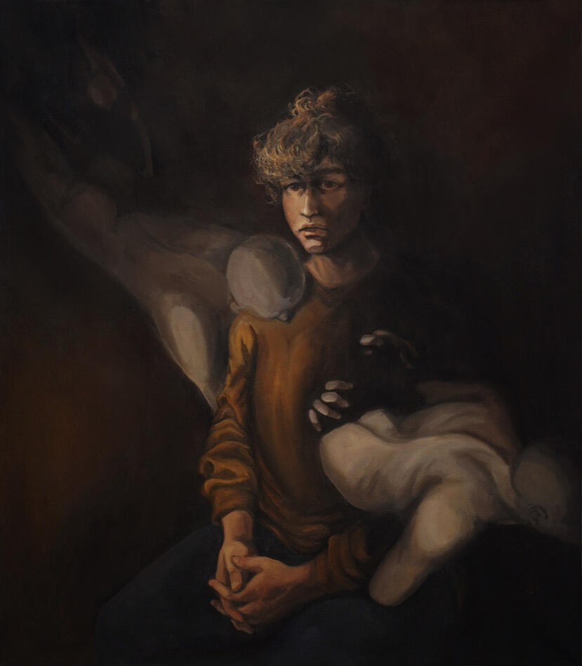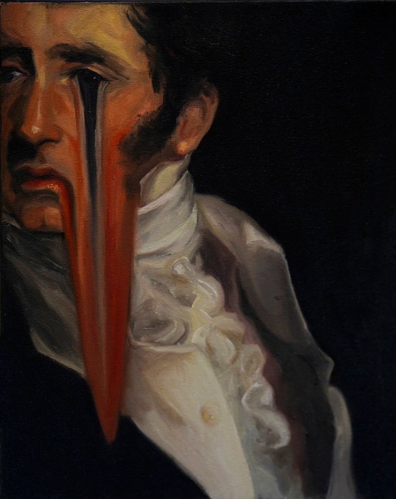 I prefer to paint non-real people, because they can act as both extensions of myself, and embodiments of the human condition. My reactions to real world issues help fuel emotion into my work, whether it be disappointment, melancholy, or disjointedness. Music influences the tone in my work and helps to kickstart my brainstorming process. I have a deep love and fascination for historical art, especially in the Baroque period. This inspiration lends to my choice of color and composition. Horror media is my final influence. This inspires a lot of my more unnerving subject matter. I can’t say why I am fascinated by the ominous, but I just find the combination of beauty and oddity creates an interesting sense of uneasiness and isolation, especially when portrayed subtly.
